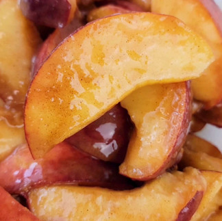 Pour sugar, brown sugar, cinnamon, and flour onto peaches and gently fold into the peaches until covered evenly.